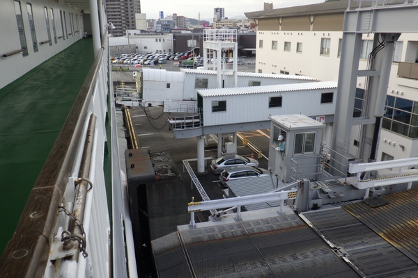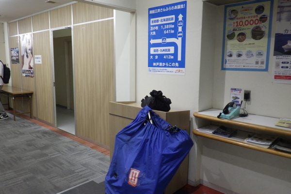 乗船。 インターネット予約を活用していると、窓口でのチェックインが省け、メールにて送られてきたQRコードを乗船口にかざすだけで乗船できる。このあたりは、「便利になったもんだ」と感心してしまう。 そして、1年前と同じく、大分下船口の業務スペースにエルコスさんを置かせてもらい、出航まで時間を潰す。