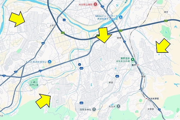 このあたりはロードサイド店舗が目立つ。 大分川の手前でR10と合流し、敷戸、中判田と抜けていくのだが、このあたりは大分市街のベッドタウンが形成されていて、それは地図を見てもはっきりわかるほど。