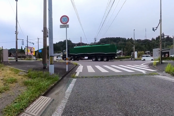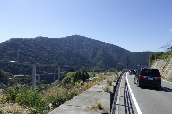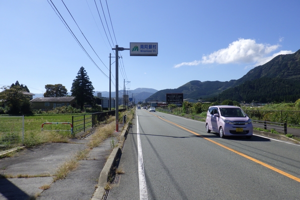 谷沿いに急な下りを駆け降りていくと、 やがて道は、新阿蘇大橋に至る。先の熊本地震で崩落し、その後再建された橋で、南阿蘇地域への主要な幹線として機能している。そして、ここから道は片側二車線になる。