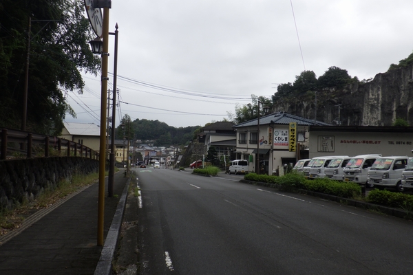 久住高原地帯の入口。 支所などがあるこの市街地の南側にバイパスが通っていて、街の中心へは側道に入る必要がある。そういえば、途中に立派な単式蒸留器が置いてあったが、