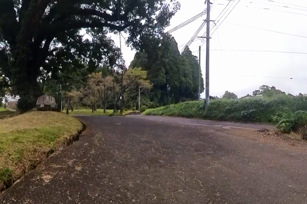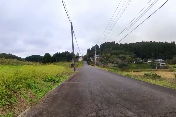 わかりづらいが、細い道が続いている。 そして最初の分岐を左に進めば、奥豊後グリーンロードとの交点に出る。