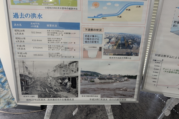ダム建設の経緯が書かれていた。 このダムが堰き止める白川は、回数こそ多くないが水害の歴史に翻弄されており、ひとたび大雨が降れば、その勢いで下流部の熊本市街を度々水浸しにさせてきた。物的被害もさることながら人的被害も甚大で、特に昭和28年の水害では、死者400名以上を出す大惨事となっていた。 このダムは、それら水害から下流部を守護するために建てられたものとある。