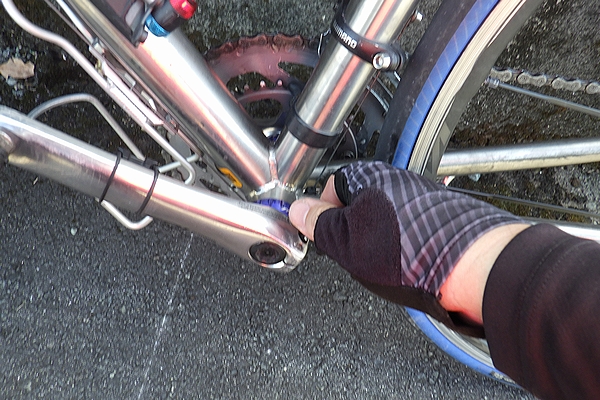 クランクを回している時に異音がして、回さずに滑空しているときは異音がしない。ホイールのトラブルではなさそうなので、一旦停まってチェックしてみることに。 そしたら停まった瞬間、クラッときた。