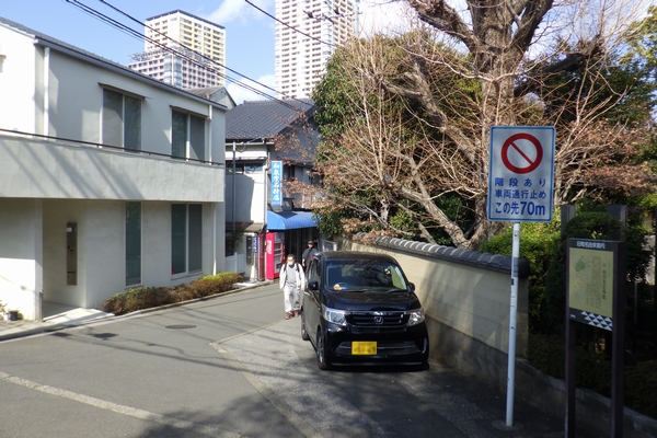 その下り勾配がまあまあ急。 表参道からそのまま直進し、宿坂方向へ。こちらは勾配が比較的マイルドになっている。なお、この道自体は高田馬場から雑司ヶ谷へと抜ける街道筋だったようで、坂の途中にある金乗院の山門付近に詳細が掲げられていた。