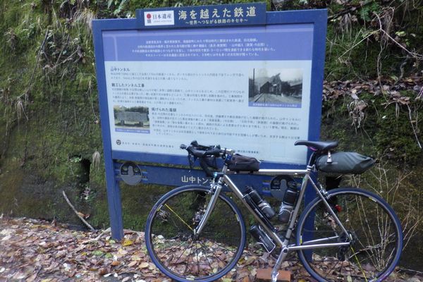 日本最古のロックシェッドらしい。 シェッドを越えたあたりで、右手から引込線跡が現れる。山中信号場はスイッチバック式の信号場で、現役時代は2本の引込線があった。