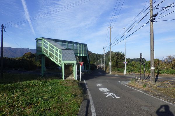 ここで下り区間が終わる。 さて、R8まで降りてくると、右手に東浦小学校、左前方には歩道橋が見えてくる。この歩道橋は杉津地区の小学生の通学用に使われているのだが、ないとないで危険が危ない。