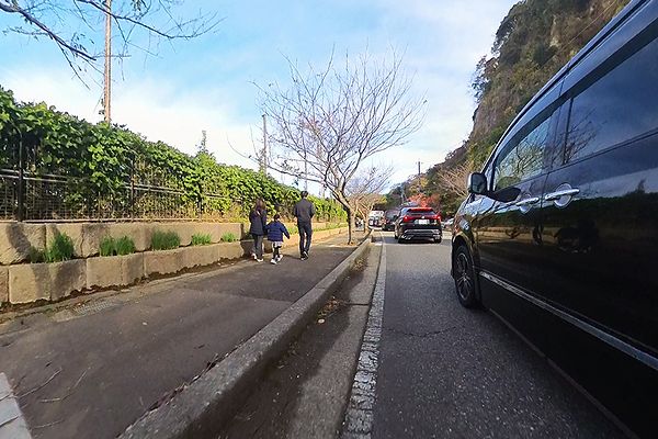 サイクリングロードかな? って感じの道が並走。 永平寺まで残り1キロとなったが、このあたりから駐車場が登場し、路肩を歩く人の数が増えだす。