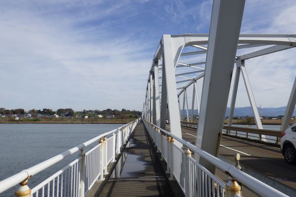 川沿いの道を進んでいくと…… やがて、大きな橋が見えてきた。県道20号の三国大橋だ。