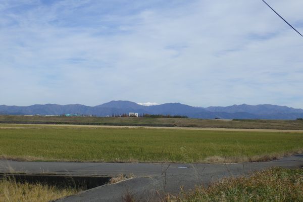稲穂の海。だけど向こうの山は雪景色。 このあたりは一大稲作地帯となっていて、たわわに実る稲穂の海がどこまでも広がっている。