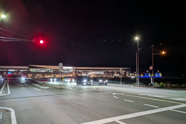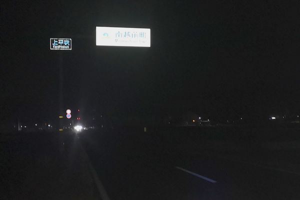 王子保でR365を左折。しばらくは真っ暗闇の田園地帯を、時折後ろからくる車列を躱しながら往く。……のだが、真っ暗闇の中、やたら左側の景色が赤い。