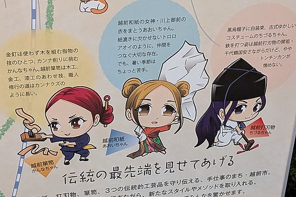 越前の新しいマスコット。こういうの見るとつい撮っちゃう。 ……オシャレだと?向新保の交点で左折。ここからR8は武生大橋区間になるが、先述の通り自転車と歩行者は通れない。